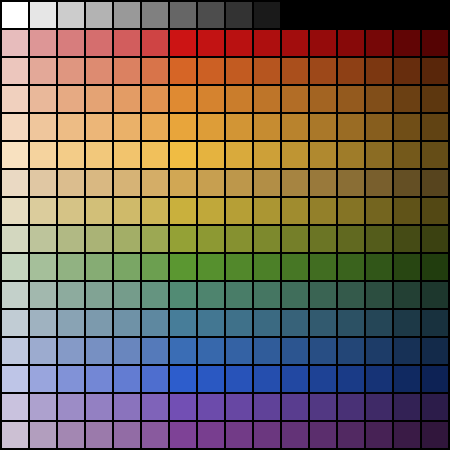 As one can see, I decided to drop one of the yellow-greens and replaced it with a more sand-colored hue. The greenish hue that took that position in the color wheel I created was particularly ugly and there's already two more hues of yellow-green. I also decided to throw out the magenta shade I had on my color wheel. While it was a nice hue, I just couldn't see myself using any of those shades for outfits or environmental objects. So I took that one off the palette as well and instead added a gray scale to make for a nice tidy 16x16 color grid.